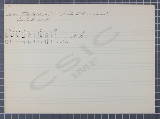Y sobre su música tenemos que decir que se ha transmitido por distintas vías. Por un lado en los fondos del CSIC publicados on-line por el InstitucióMilà i Fontanals, Barcelona en su Fondo de Música Tradicional podemos encontrar la Misión 53. Se conserva en una Caja/archivador verde pequeño con la etiqueta “LEÓN / M. García Matos / Misión Nº 53. 1951” que contiene: 63 fichas de piezas instrumentales numeradas 1 a 56 (y 13 fichas correspondientes a sus cuatro informantes); 135 fichas de melodías con texto numeradas 1 a 134 (y 19 fichas correspondientes a siete informantes, que incluyen a tres informantes de las piezas instrumentales); y 37 cuartillas (numeradas 1-36, incluye 3bis) con textos mecanografiados de algunas de las canciones. Y este trabajo están recogidos temas de las siguientes localidades: Astorga, Castrillo de la Valduerna, La Bañeza, Matarrosa del Sil, Noceda del Bierzo, Quintanilla de Somoza, Santiago Millas, Tejedo de Ancares/Teixeu de Ancares (Candín), Val de San Lorenzo, Valdespino de Somoza y Villalibre de Somoza. Este trabajo fue realizado por Manuel García Matos musicólogo afín al Régimen del momento y que pudo realizar su labor contando con apoyos y del que como obra principal ha trascendido su Magna Antología del Folclore de España.